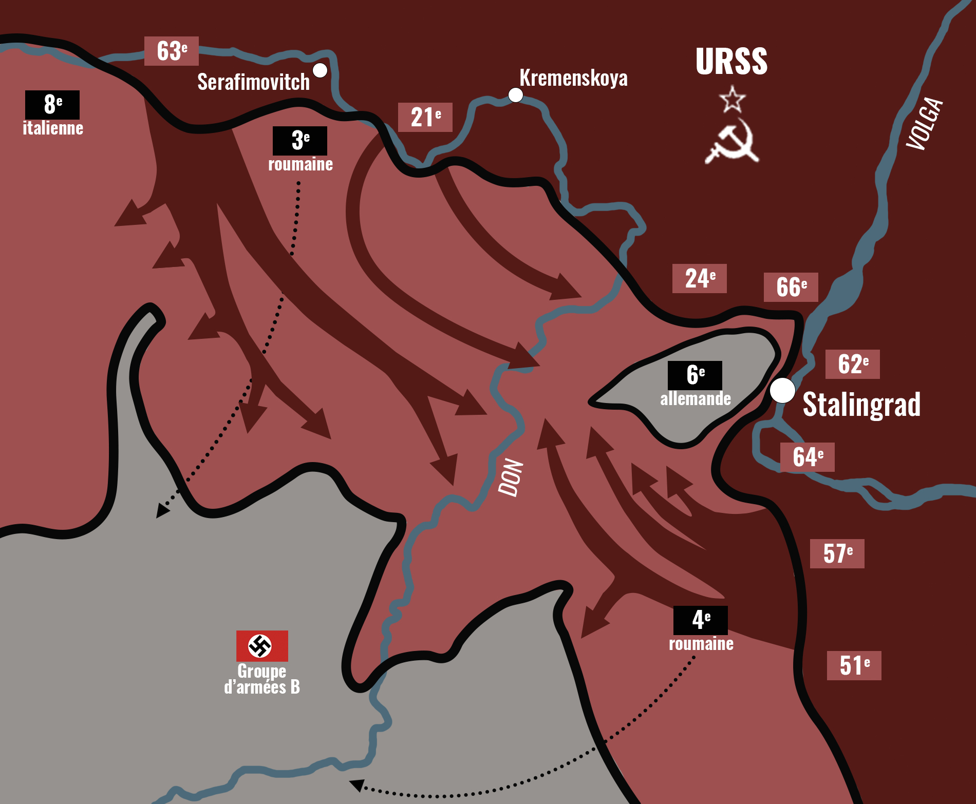 Lancée le 19 novembre 1942, l’Opération Uranus est la contre-offensive soviétique visant à encercler les forces allemandes. En attaquant les flancs tenus par les troupes roumaines et hongroises, l’Armée rouge a réussi à piéger environ 300 000 soldats de l’Axe dans une poche appelée le « chaudron » (Kessel).