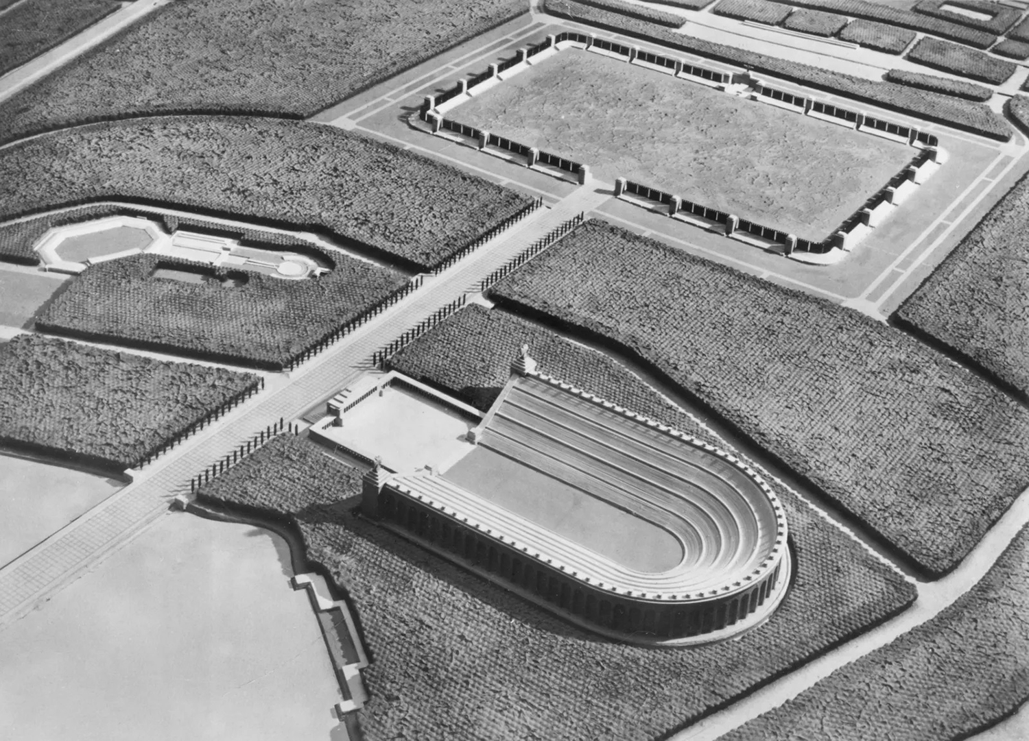 Le projet le plus démentiel fut sans doute le Deutsches Stadion, dont la première pierre fut posée en 1937. Ce stade n’avait pas pour vocation d’accueillir des Jeux Olympiques internationaux, mais des compétitions strictement aryennes. Les chiffres défient l’entendement : le stade devait accueillir 400 000 spectateurs. Il aurait ainsi fallu plus de cinq stades comme celui de Berlin en 1936 pour atteindre une telle capacité. Les plans prévoyaient une structure en fer à cheval de 550 mètres de long sur 460 mètres de large, avec des tribunes s’élevant à 100 mètres de hauteur.