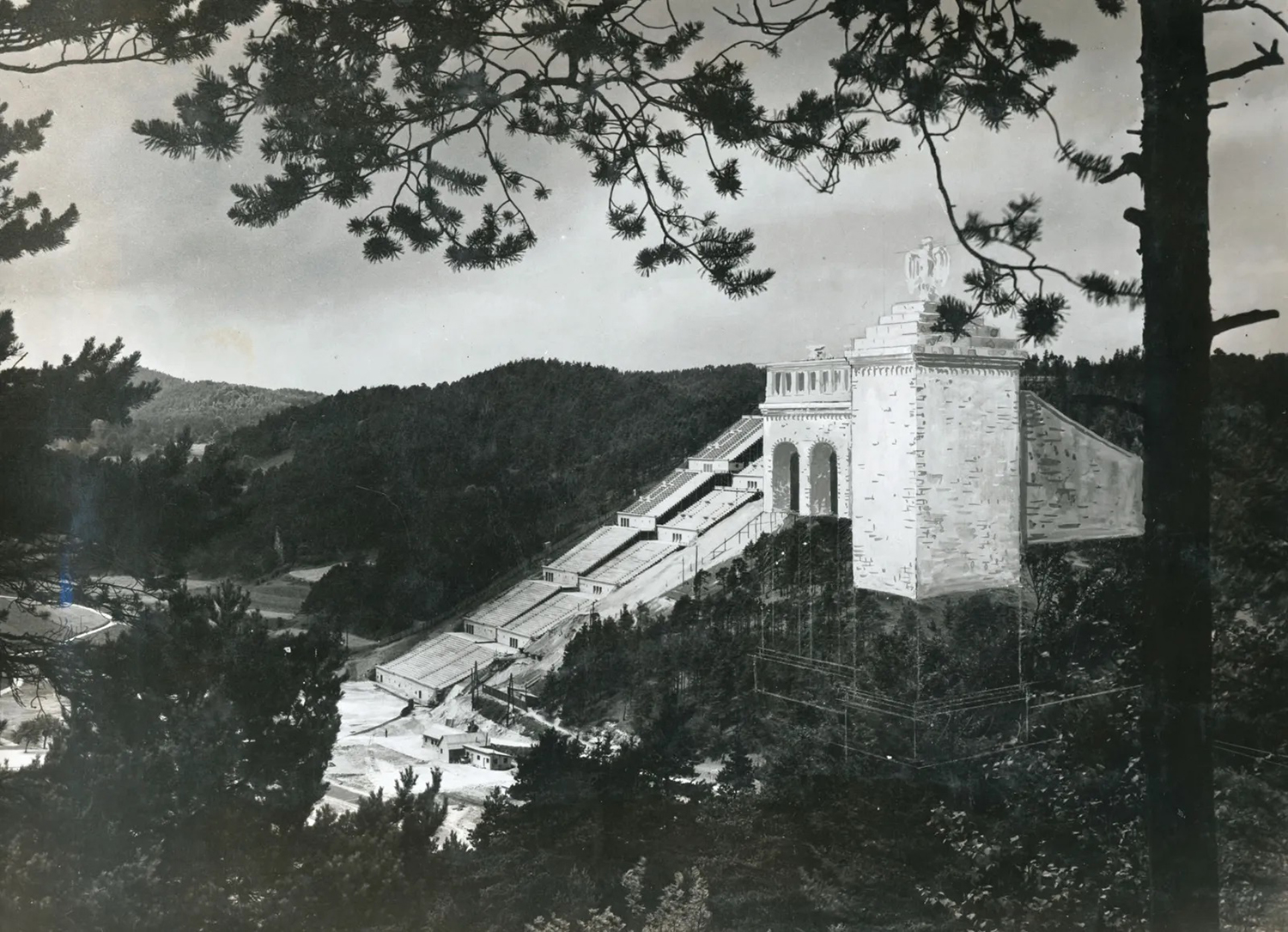 Pour vérifier si l’œil humain pouvait distinguer un athlète depuis les rangs supérieurs, Speer ordonna la construction d’une maquette grandeur nature d’une section de tribune dans les bois de Hirschbach, en Haute-Palatinat. Ce modèle, construit par 400 ouvriers, utilisait d’immenses structures en bois pour simuler l’inclinaison des gradins. Le projet fut abandonné alors que seules les fondations avaient été amorcées. Le site du chantier, inondé après la guerre, a donné naissance au Silbersee, un lac dont les eaux sont encore aujourd’hui polluées par les résidus de soufre des industries voisines. Le rêve de granit s’est transformé en un étang toxique.